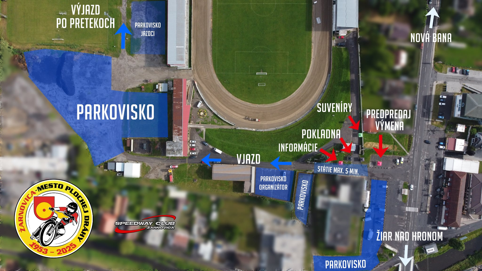 Parkovanie áut fanúšikov je zabezpečené na viacerých miestach. Do 13.00 hod., respektíve do zaplnenia miesta je možné parkovať zadarmo v areáli štadióna. Vstup s autom je možný po zakúpení vstupeniek smerom od Motela. Odchod po pretekoch bude možný z druhej strany od Jednoty. Parkovať bude možné aj na parkoviskách okolo Motela a z druhej strany štadióna popri plote smer od Jednoty.