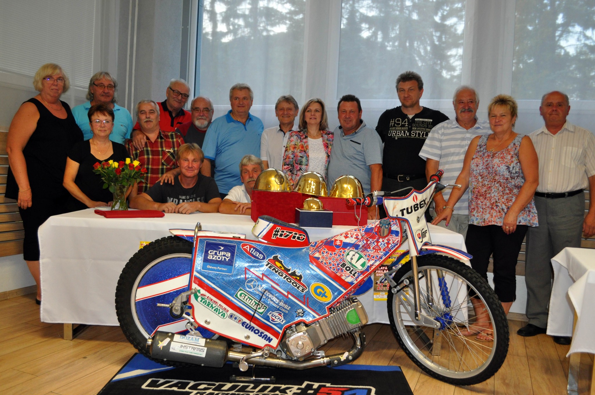Privítal ich predseda Automotoklubu Plochá dráha Zdenek Repiský a vyzval Ing. Jozefa Treščáka, aby sa s prítomnými podelil o spomienky, ktoré získal počas polstoročia aktívnej činnosti okolo plochej dráhy. Ten vyzdvihoval najmä skutočnosť, že plochá dráha v Žarnovici je jedinou na Slovensku. A to nielen posledných viac ako 30 rokov, ale že ňou bola aj v minulosti a paradoxne aj pri vzniku v roku 1953. V histórii našej krajiny sa nenájde motocyklové a automobilové športové podujatie, ktoré by sa začalo organizovať skôr a pretrvalo by aj doteraz, Žarnovická plochá dráha je zaslúžene najstarším motoristickým podujatím na Slovensku a patrí jej aj významné postavenie na plochej dráhe medzi klubmi v bývalom Československu. Väčšou tradíciou ako Zlatá prilba SNP sa môže pochváliť len Zlatá prilba v Pardubiciach. Boli spomenutí najčastejší víťazi pretekov, Jiří Štancl, Antonín Kasper mladší a Martin Vaculík, strojca nebývalého oživenia tohto športu v našom meste. Ten narobil usporiadateľom starosti, keď natrvalo získal tretiu zlatú prilbu a musela byť zaobstaraná trofej nová. Medzi hosťami bol prvý päťnásobný víťaz žarnovických pretekov Jiří Štancl. U nás štartoval rád, pokiaľ mu to reprezentačné povinnosti dovolili. Pardubice a Žarnovica boli jeho obľúbené dráhy. Okrem šiestich Zlatých prilieb absolvoval v Žarnovici aj ďalších sedem podujatí a vždy sa stal ich najlepším účastníkom. Tradovala sa hláška: “Keby bolo svetové finále v Žarnovici“, čo znamenalo, že Štancl sa mohol stať majstrom sveta. So slzami v očiach spomínal na rok 1985, keď sa rozplynul jeho sen o druhej zlatej prilbe SNP. O centimetre ho porazil Antonín Kasper, aby on začal svoju víťaznú šnúru. Na rad prišiel krst novej zlatej prilby, vystavenej spolu s prvou prilbou Jiřího Štancla a treťou prilbou Martina Vaculíka. Krstnými rodičmi boli Ing. Alena Kazimírová a zaslúžilý majster športu Jiří Štancl. Nasledoval prípitok primátora mesta Kamila Danka a potom už družné posedenie ľudí, ktorí si mali medzi sebou čo povedať.